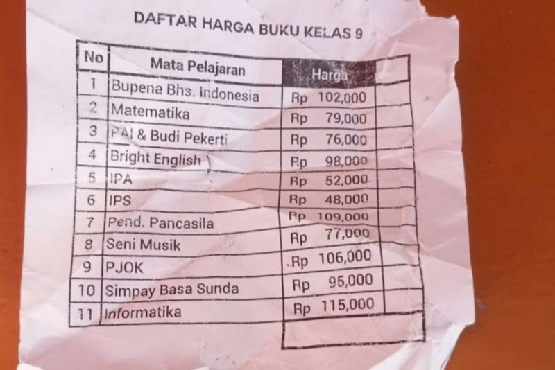 Berdasarkan data yang diperoleh dari orang tua siswa, total harga paket buku untuk kelas 9 mencapai lebih dari Rp900.000 per siswa. Rincian daftar harga itu mencakup 11 mata pelajaran, dengan harga per buku bervariasi mulai dari Rp 48.000 hingga Rp115.000.
